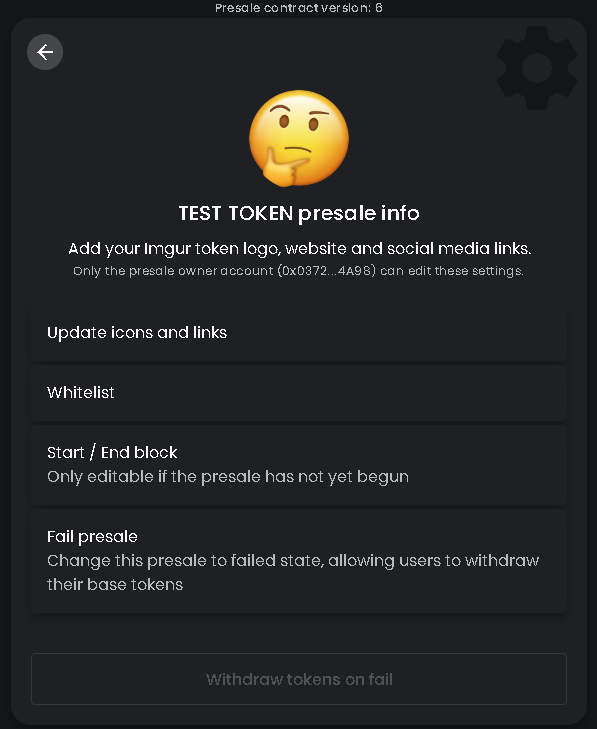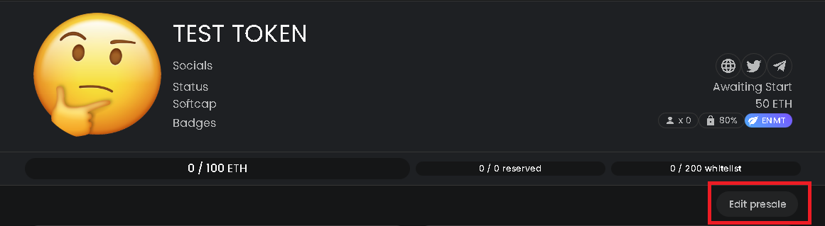 You will be taken to the page presented below. From that page you are able to edit your icons and social media links, whitelist spots, start date and end date of your presale, or fail it and withdraw your tokens (not user contribution).