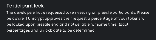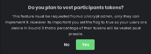 You can request a vesting for tokens sold on your presale, preventing them from being sold for a period of time. The vesting has to be done by the UNCX team member, selecting "Yes" option presented below does not lock the tokens. It just provides an information on your ILO page for your investors.\