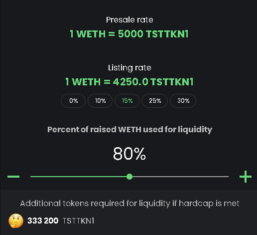 The next step is adjusting the listing rate, and deciding how many of the funds you raise you want to use for liquidity. Below the slider you can see how many additional tokens will be required for liquidity.