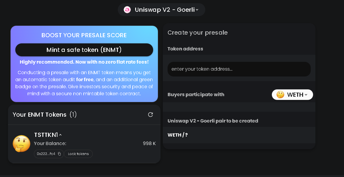 Now, you have to choose the token you want to use for your ILO. If you are using a token created by our ENMT Token Minter, it will appear on the left side as displayed on the screenshot below. If you already have your own token, just paste the address into the empty field.