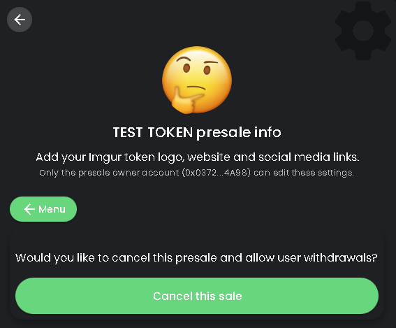Last thing you can do from the edit page is failing your presale. After you select "cancel this sale" you will be able to withdraw your tokens from the edit page.