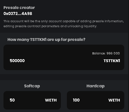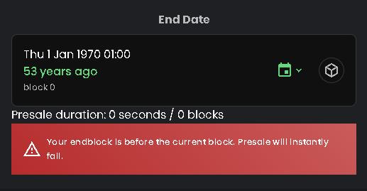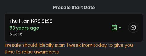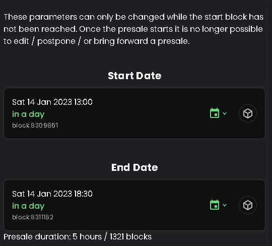 **NOTE:** Keep in mind that the minimum start date is 4 hours from the presale creation time, and if you set it lower it will be set to 4 hours automatically.