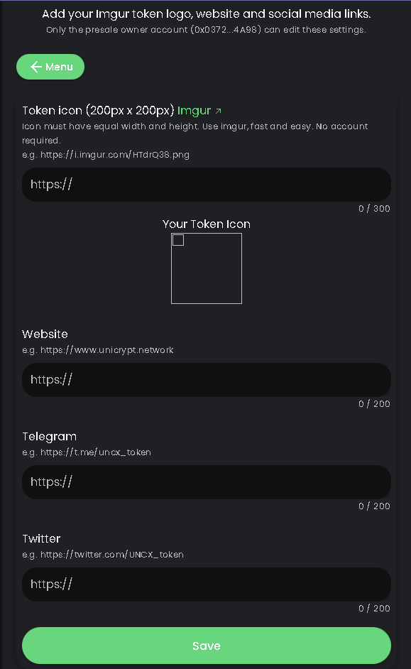 First button takes you to the screen presented below. There you can adjust all your social links and token icon.&#x20;