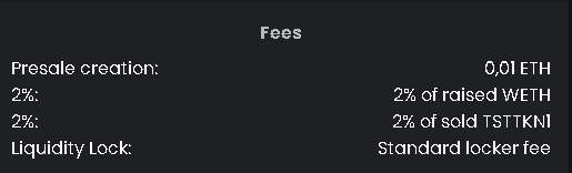<figure><img src="https://2670842263-files.gitbook.io/~/files/v0/b/gitbook-x-prod.appspot.com/o/spaces%2FinUXJ41rMT4w6Y9U1Kol%2Fuploads%2FhW1MfXPibVlRNfH1ZCA5%2FILO%20-%20fees.png?alt=media&#x26;token=a1be5c22-9207-4845-b980-70ebedfba501" alt=""><figcaption><p>Fees for presale creation</p></figcaption></figure>