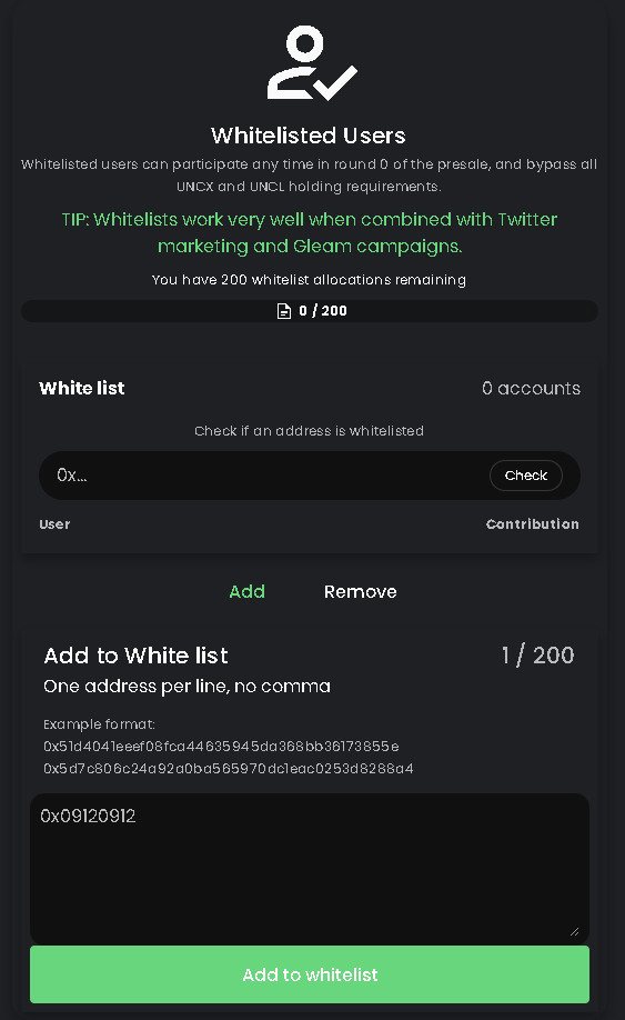 `(UNCX team will not provide you with a presale spot presales are managed by their respective teams and whitelist request should be addressed to them).`